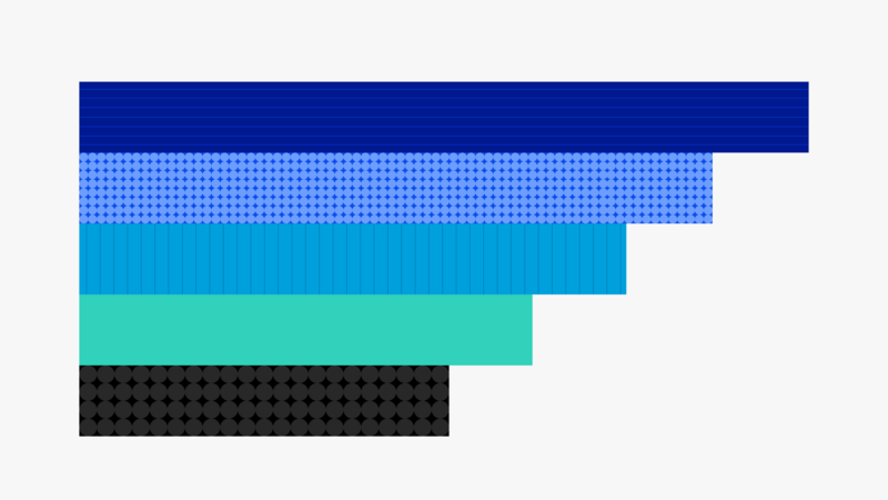 Elements with complex information like charts and graphs can be hard to read when only color is used to distinguish the data. Try to use other visual aspects to communicate information, such as shape, labels, and size. Incorporating patterns into the shape fills also make differences clearer; for an example please see below:
